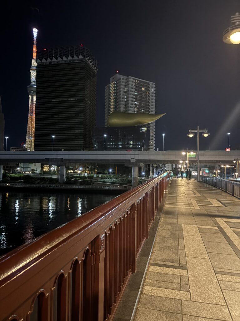 そして、橋のたもとから対岸を見上げれば、そこには通称「金のウンコ」としてお馴染みのアサヒグループ本社ビルがそびえ立っています。